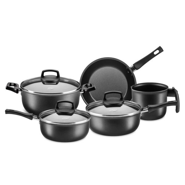 São 5 panelas de diferentes tamanhos de 1,2mm de espessura, tem um acabamento reforçado e revestimento de última geração proporcionando excelentes resultados na hora de cozinhar.