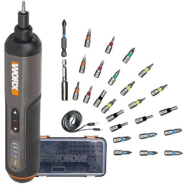 Seu kit conta com 24 bits diferentes, categorizados por cores, além de um bit de impacto de 50mm, uma haste de extensão magnética e um cabo de carregamento USB de 91cm para carregá-la.
