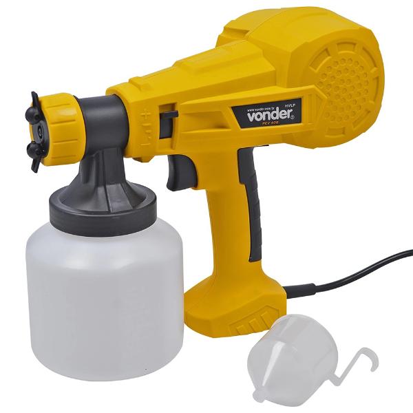 A Pistola de Pintura Elétrica 400W 220V Vonder PEV400 é Indicada para aplicações profissionais e domésticas de tintas sem pigmentos metálicos, como tintas automotivas, látex, vernizes, esmalte à base sintética e à base de água. Ideal para pintura de portas, portões, janelas, cadeiras, banquetas, brinquedos, artesanatos, entre outros. Aceita líquidos com viscosidade inferior a 40 DIN/S (acompanha medidor de viscosidade). Possui corpo e caneca em plástico, que proporcionam maior leveza à pistola e menor fadiga ao operador.