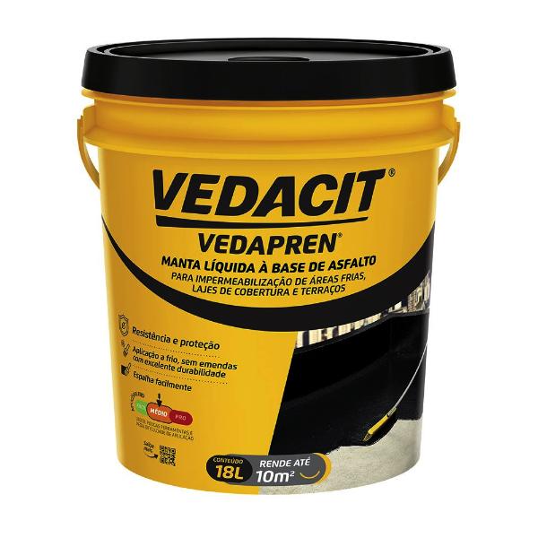 VEDACIT VEDAPREN* é uma manta líquida, de base asfalto elastomérico e aplicação a frio sem emendas, pronta para uso e moldada no local. Cobre a estrutura com uma proteção impermeável e apresenta ótimas características de elasticidade, flexibilidade e aderência, tendo uma grande durabilidade.